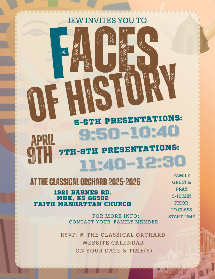 IEW warmly invites guests of our 5th–6th grade students to join us for a special day celebrating history as they present their Faces of History projects. A reception and photo opportunities will follow the presentations.